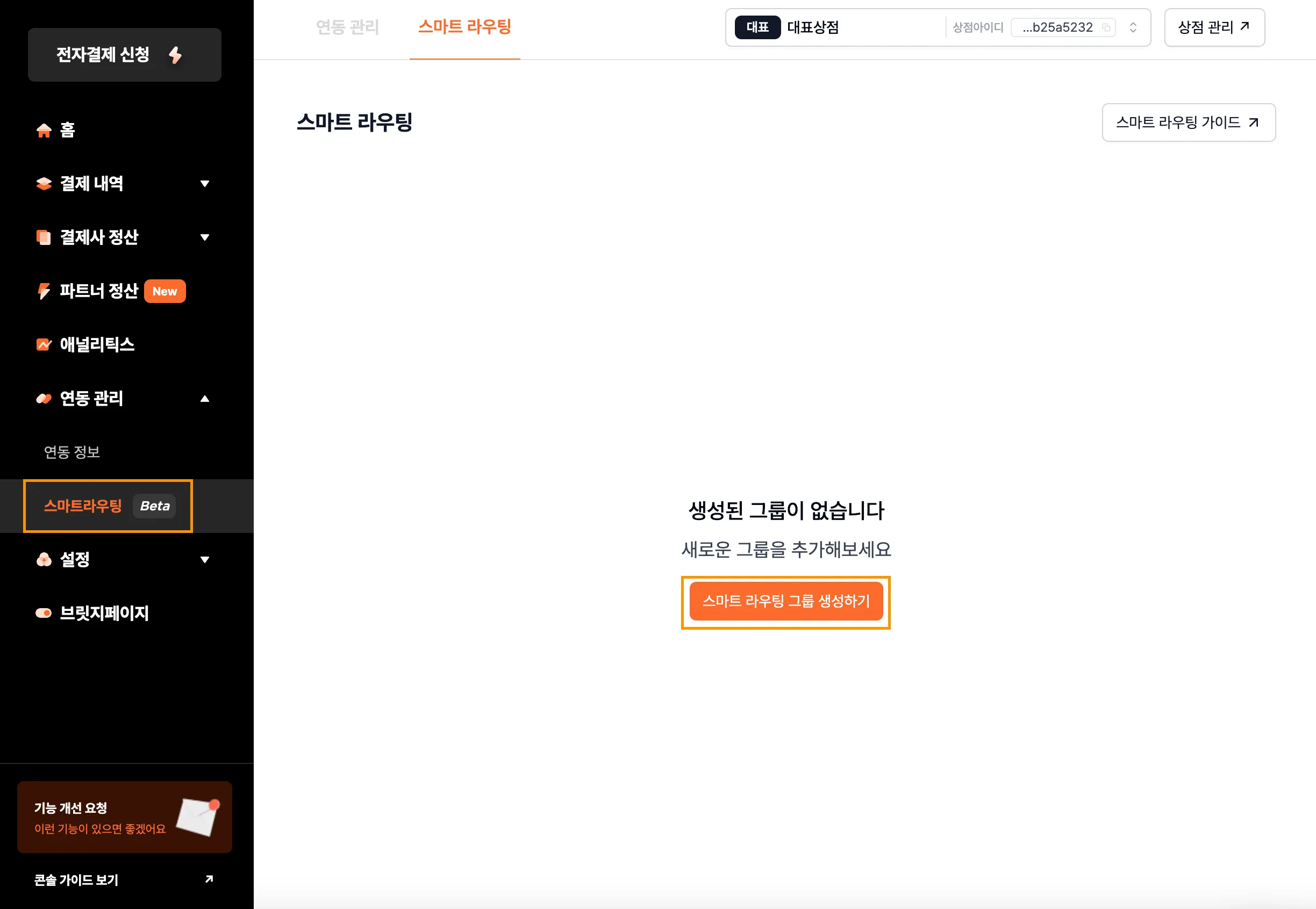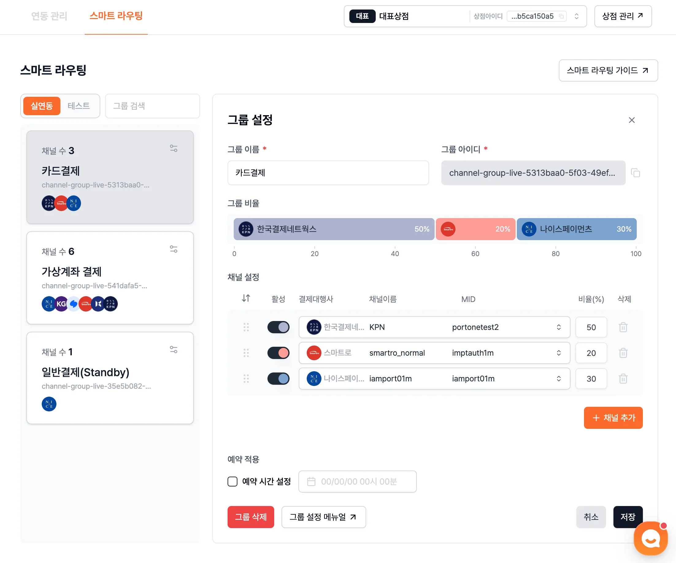 스마트 라우팅을 사용하기 위해서는 포트원 관리자콘솔 내 [연동 관리] - [스마트 라우팅]에서 그룹 설정이 필요합니다.