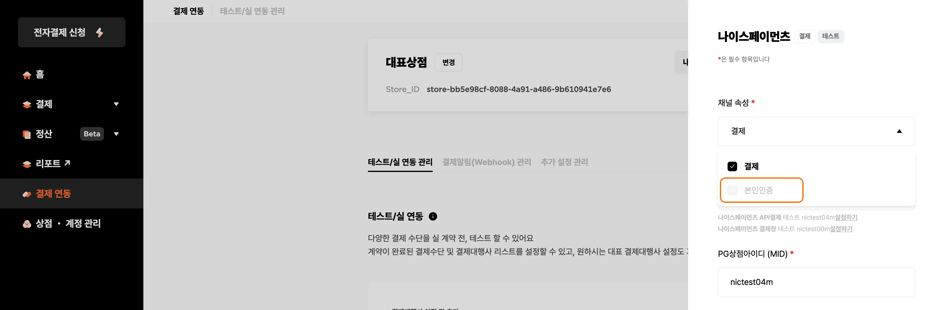 ✔️ 결제연동 설정 시, 결제대행사로 다날 또는 KG이니시스를 선택하는 경우에만 본인인증을 선택할 수 있습니다