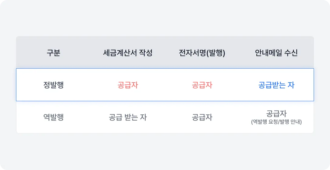 기존 역발행과 다르게 정발행은 파트너 등록 및 국세청 연동 없이 이용할 수 있으며, 파트너 등록을 하지 않더라도 정발행시 입력한 공급받는 자(거래처) 정보를 다시 불러와 사용할 수 있습니다.